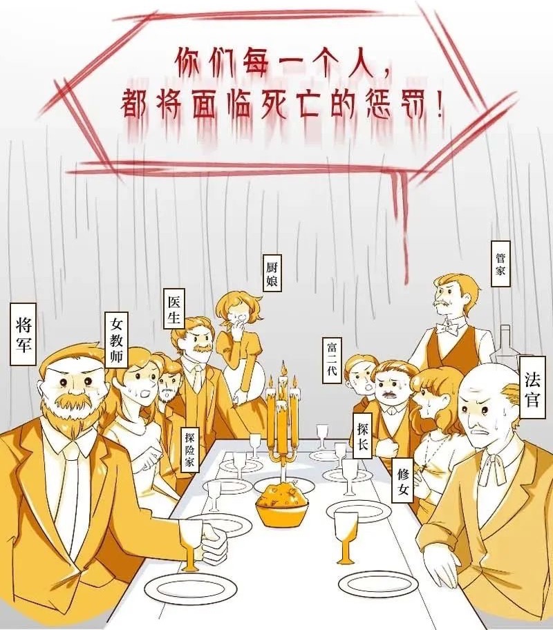 这本书写了一个很有趣的故事,8个有着不同背景的人--退伍将军、女教师、富二代、医生、探险家、法官、前警官、老修女,或是收到故友来信,或因为朋友的邀请,一起来到了一座海上的孤岛上度假,到了后才发现孤岛的主人因为有事要晚一天才到。孤岛上只有一座别墅,由提前到达的2位管家接待他们。当这8位客人回到各自的房间里放置行李的时候,发现镜框里裱了一张很大的羊皮纸,上面印了一首童谣: