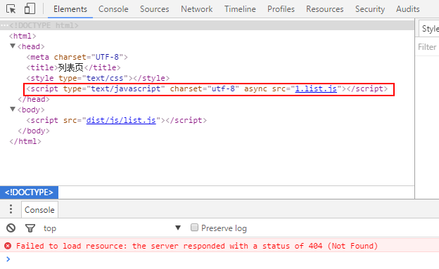 接着使用浏览器打开list.html,用调试器查看页面元素,会发现为head部分新插入的script标签,引用了1.list.js。