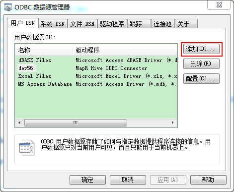 可以从这里下载各个版本的HIVE ODBC:http://archive.mapr.com/tools/MapR-ODBC/MapR_Hive/