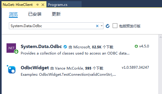 配置好了ODBC数据源之后,新建一个.Net Core项目,首先通过NuGet包管理器安装 System.Data.Odbc。
