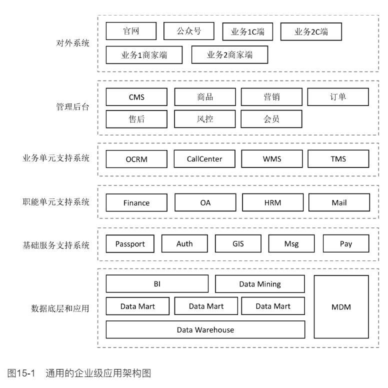企业级应用架构正是指企业的各个软件系统有机集成在一起的方式。下面是典型的企业级应用架构图,它可以体现出企业系统设计的整体结构特征、逻辑分层特征,以及功能模块的抽象特征。