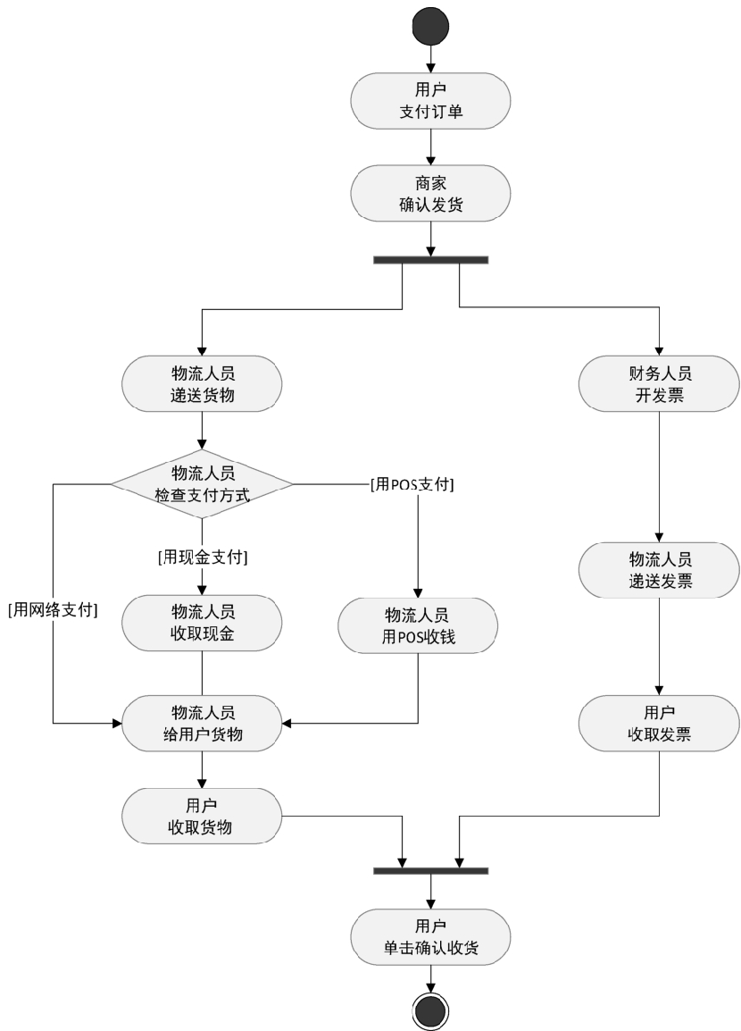 在货物和发票都分别寄送给用户之后,用户必须等到货物和发票都收到了,才会单击确认收货,任何一个没有收到,用户都不会单击确认收货。这个时候就要用到“汇合”的表达,如图7-12所示。汇合的画法是一条粗横线,再加上多条进入的线条和一条出的线条。