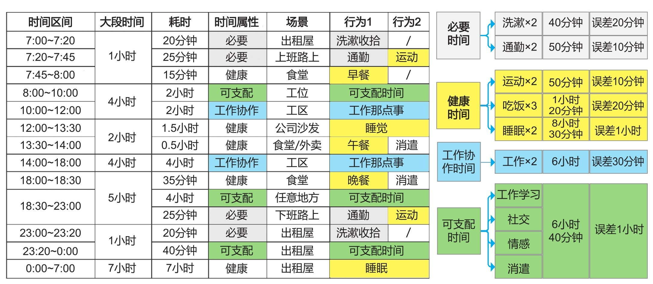- 必要时间:属于刚性时间,难以压缩和挪作他用的(但有些可以并行利用),例如 吃饭、洗澡、睡觉、通勤、洗漱 等,是每天必需要投入的时间。