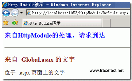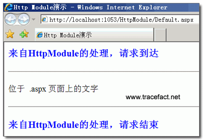 然后我们再新建一个 Default2.aspx,在浏览器中浏览,可以看到,两个页面的效果相同。这说明对于不同的两个文件,http Module都起了作用,可见它确实是位于应用程序级,而非页面级。