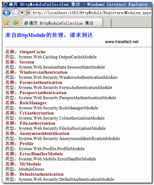 现在,我们通过遍历 HttpModuleCollection 集合来查看注册给应用程序的所有 Http Module 的名称。
