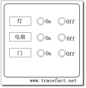 我们假设控制器只能控制 三个电器,分别是:灯、电扇、门(你就当是电子门好了^^)。那么我们的控制器应该有三组,共六个按钮,每一组按钮分别有“On”,“Off”按钮。同时,我们规定,第一组按钮对应灯,第二组按钮对应电扇,第三组则对应门,那么控制器应该就像这样: