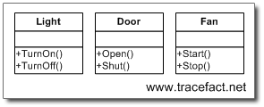 好了,控制器大致是这么个样子了,那么 灯、电扇、门又是什么样子呢?如果你看过前面几节的模式,你可能会以为此时又要为它们创建一个基类或者接口,然后供它们继承或实现。现在让我们先看看我们想要控制的电器是什么样子的:
