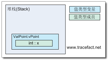 当声明一个值类型的变量(Variable)的时候,变量本身包含了值类型的全部字段,该变量会被分配在线程堆栈(Thread Stack)上。
