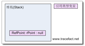 当声明一个引用类型变量的时候,该引用类型的变量会被分配到堆栈上,这个变量将用于保存位于堆上的该引用类型的实例的内存地址,变量本身不包含对象的数据。此时,如果仅仅声明这样一个变量,由于在堆上还没有创建类型的实例,因此,变量值为null,意思是不指向任何类型实例(堆上的对象)。对于变量的类型声明,用于限制此变量可以保存的类型。