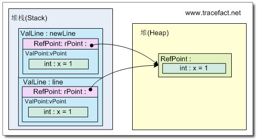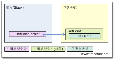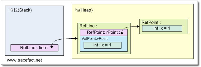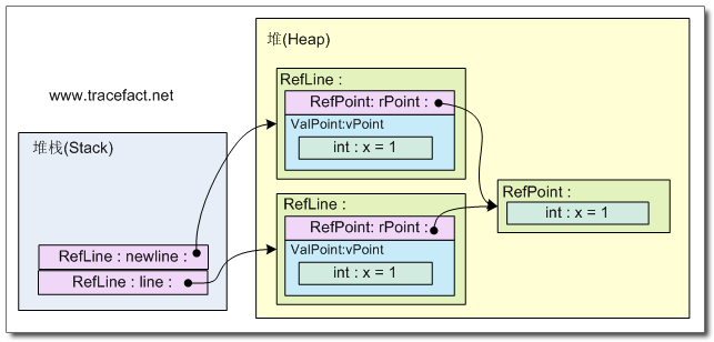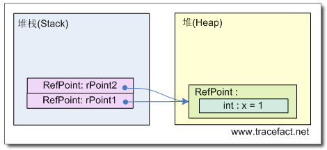 在阅读本文中,应该时刻在脑子里构思一个堆栈,一个堆,并思考着每条语句会在这两种结构上产生怎么样的效果。在这段代码中,产生的效果是:在堆上创建了一个新的RefPoint类型的实例(对象),并将它的x字段初始化为1;在堆栈上创建变量rPoint1,rPoint1保存堆上这个对象的地址;将rPoint1 赋值给 rPoint2时,此时并没有在堆上创建一个新的对象,而是将之前创建的对象的地址复制到了rPoint2。此时,rPoint1和rPoint2指向了堆上同一个对象。