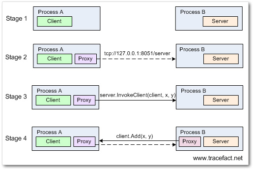 从上面这幅图可以很清楚地看到服务端代理的创建过程:首先在第1阶段,客户端服务端谁也不知道谁在哪儿;因此,在第2阶段,我们首先要为客户端提供服务端对象的地址和类型元数据,有了这两样东西,客户端便可以创建服务端的代理,然后通过代理就访问到服务端对象;第3阶段是最关键的一步,在客户端通过代理调用InvokeClient()时,将client对象以传引用封送的方式传递了过去,我们前面说过,在传引用封送时,它还包括了这个对象的位置,也就是client对象的位置和端口号;第4步时,服务端根据客户端位置和类型元数据创建了客户端对象的代理,并通过代理调用了客户端的Add()方法。