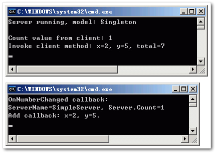 上面是服务端,下面是客户端。我们在调用server.DoSomething()方法时,触发了事件,所以调用了客户端的OnNumberChanged,产生了客户端的前两行输出;调用GetCount()时,客户端没有产生输出,服务端输出了“Count value from client: