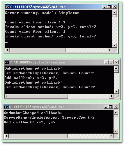 这里可以发现两点:由于第二个客户端再次调用了DoSomething()方法,所以它再次触发了事件,因此在第一个客户端再次产生了输出“OnNumberChanged Callback...”;再次调用GetCount()方法时,对于服务端来说,是一个新建的客户端localClient对象,所以count值继续输出为1,也就是说两个客户端对象是独立的,对服务器来说,可以将客户端视为客户激活方式(Client-Actived Model)。