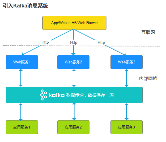 上面的三个作用,第一条就讲到,kafka是一个消息系统。那么什么是消息系统?它解决了什么样的问题? 我们以时下流行的微服务为例,假设Web端有Web1、Web2、Web3三个面向终端(微信公众号、手机App、浏览器)的Web服务(Http协议),内部有App1、App2、App3三个应用服务(远程过程调用,例如WCF、gRPC等),如果没有消息系统,采用直连的方式,它们之间的通信方式可能是这样的: