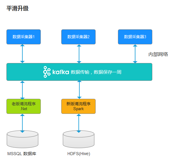 因为引入了Kafka,所以不管是老版的前端应用、数据采集、还是清洗程序,都不需要做任何的改动。就可以接入新版的采集/清洗程序,因为只要从Kafka中取数据就好了。