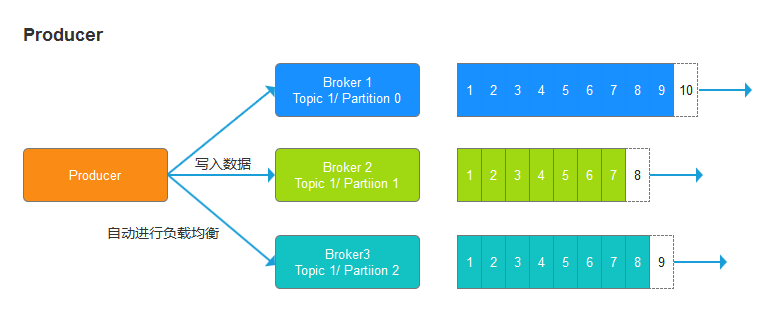 Producer只需要指定Topic的名称(Name),然后连接到集群中的任意一个节点,Kafka会自动进行负载均衡,并将对写入操作进行路由,从而写入到正确的Partition当中(多个Partition将位于集群中的不同节点)。
