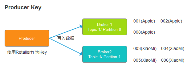 这样,所有Apple的订单会按次序发往同一个Partition,而所有XiaoMi的订单会按次序发往同一个Partition。这两个Partion可能是同一个,也可能不同。如下图所示:
