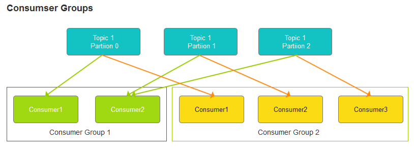 一个Topic可以有多个Group,一个Group内可以包含多个Consumer。对于群组内的Consumer来说,它们是生产者/消费者模式,一个消息只能被Group内的一个Consumer消费;对于不同的群组来说,它们是发布者/订阅者模式,同一个消息会被发送给所有的群组。下图很好地描述了这样的关系: