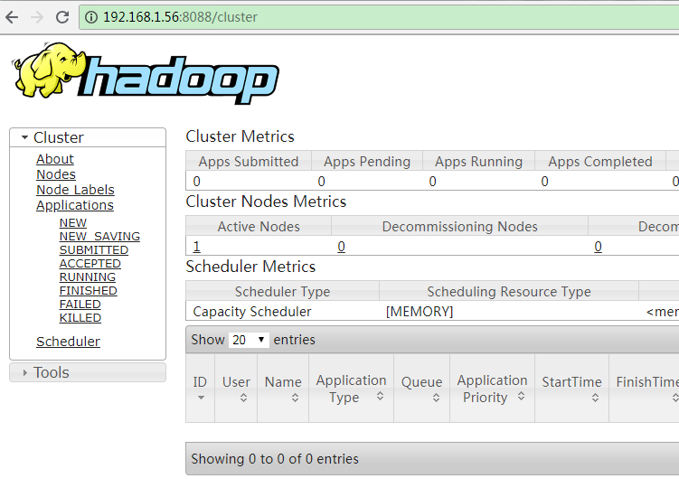 当启用YARN之后,就可以查看ResourceManager的Web UI了,使用浏览器打开http://192.168.1.56:8088: