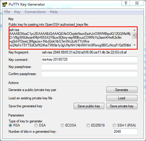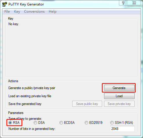 选择RSA,然后点击Generate。接下来晃动鼠标,以鼠标位置作为随机数来来生成Key。