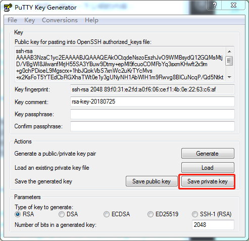 在对话框中点击“save private key”,命名为key.ppk,并保存至D:\根目录下。