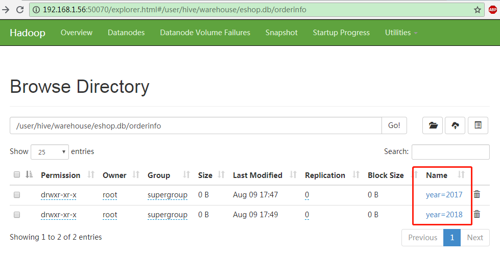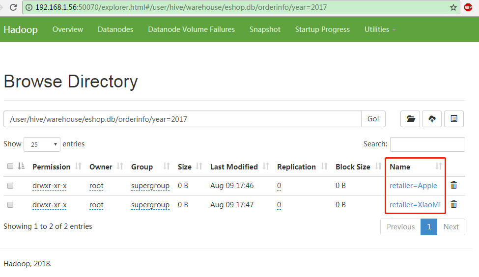 可以看到用作分区的虚拟列Year和Retailer也可以包含在Select当中。接下来查看一下HDFS: