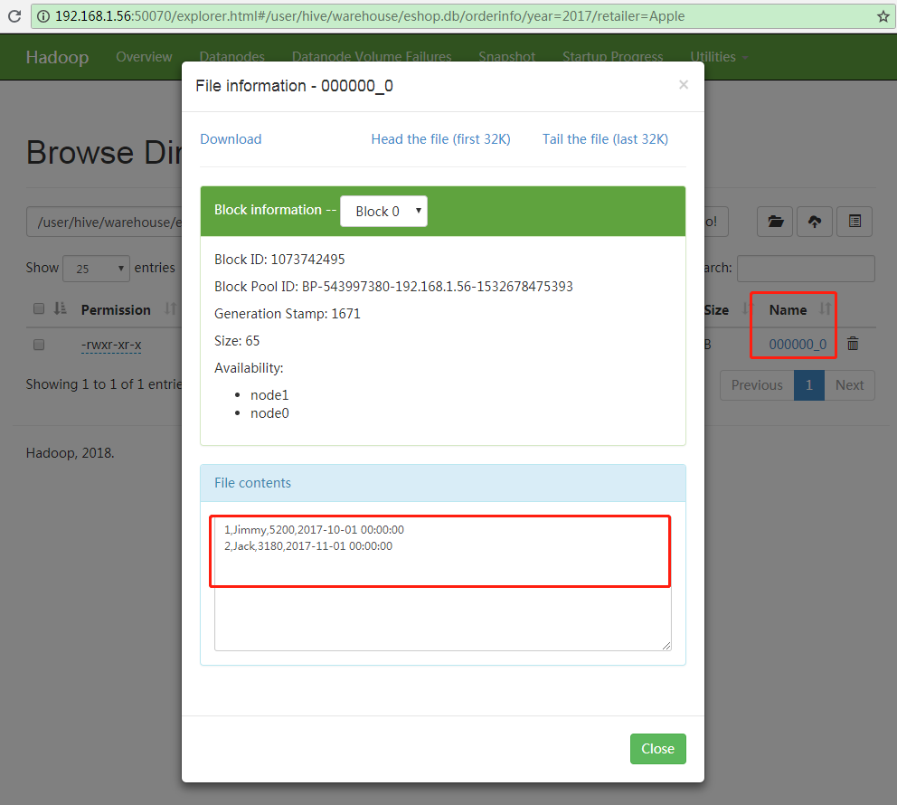 继续查看HDFS,可以看到分为了2个文件,一个文件ID全是奇数1,3,5,7,另一个文件ID全是偶数2,4,6。可能因为OrderId为int型,所以没有Hash,就直接根据桶数2进行取模了吧。