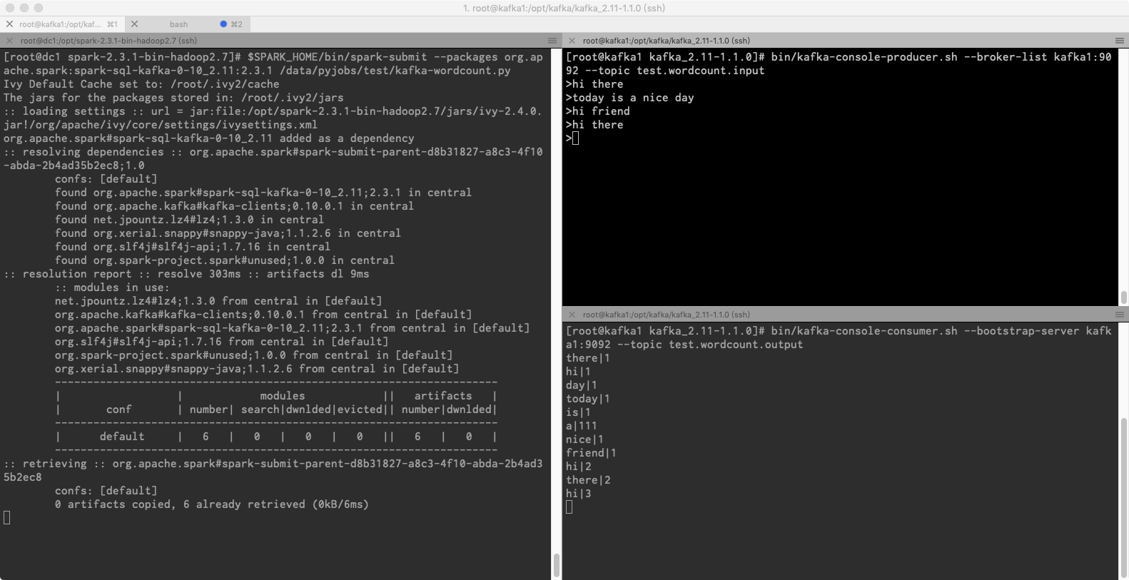 # $SPARK_HOME/bin/spark-submit --packages org.apache.spark:spark-sql-kafka-0-10_2.11:2.3.1 /data/pyjobs/test/kafka-wordcount.py
