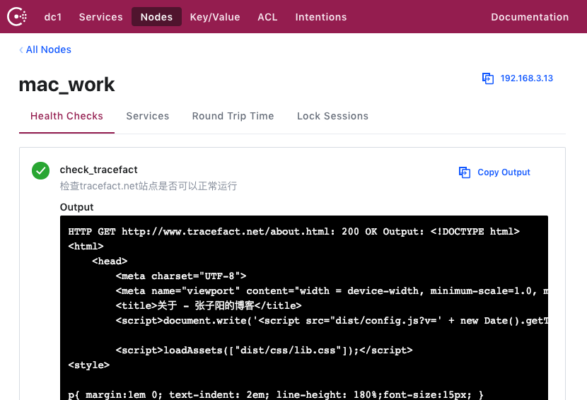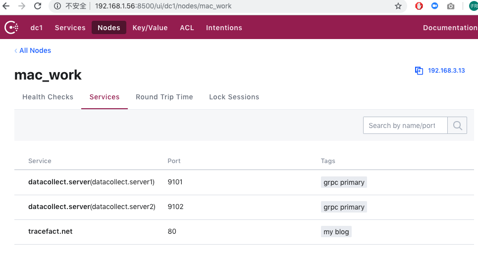 执行consul reload重新加载配置后,可以看到mac_work上注册一个tracefact.net服务,而这个tracefact.net本身运行在远程服务器上。