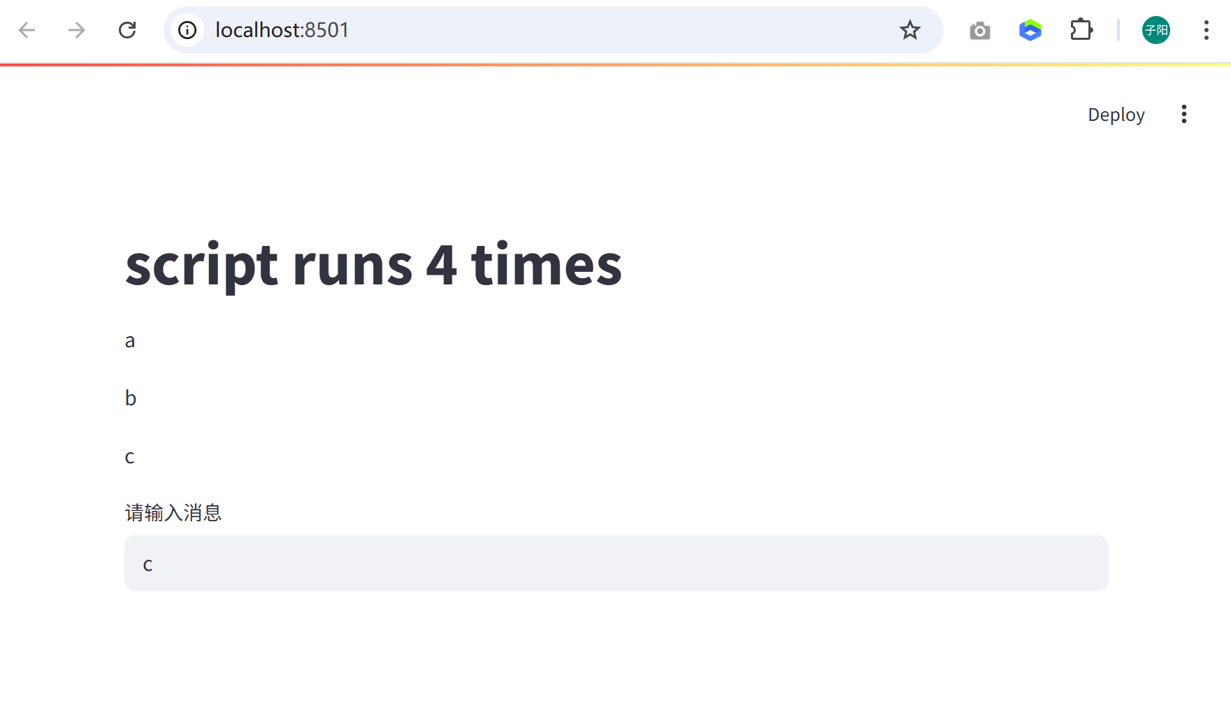 import streamlit as st if "couter" not in st.session_state: st.session_state.couter = 1 else: st.session_state.couter += 1 title = f'script runs {st.session_state.couter} times' st.title(title) # 打印历史消息 if "msgs" not in st.session_state: st.session_state.msgs = [] container = st.container() for msg in st.session_state.msgs: container.write(msg) print(f'contents:{ st.session_state.msgs }') msg = st.text_input("请输入消息") print(f'input:{ msg }') # 打印最新消息 if msg: container.write(msg) st.session_state.msgs.append(msg) # 加入列表,下次渲染时使用