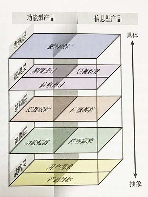 自下而上,将产品划分为五个层面。这五个层面纵向又切分为了两种不同类型:功能型 和 信息型。功能性的网站,例如机票预订网站;信息型的网站,例如网易新闻。