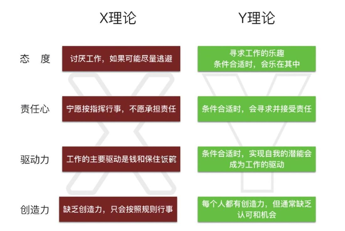X理论则相反,它认为对员工来说,工作是一件讨厌的差事,能避就一定会避,而工作的驱动力是钱和保住饭碗,所以员工需要被控制和安排工作。