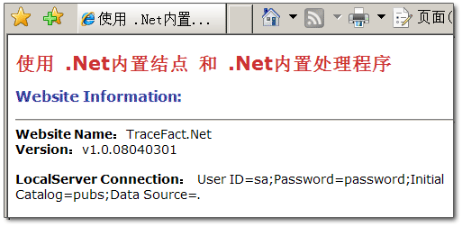 <?xml version="1.0"?> <configuration> <!-- Basic.aspx,使用.Net内置的结点和处理程序 --> <appSettings> <add key="SiteName" value="TraceFact.Net"/> <add key="Version" value="v1.0.08040301" /> <add key="GreetingLanguage" value="Chinese" /> </appSettings> <connectionStrings> <remove name="LocalSqlServer"/> <add name="LocalServer" connectionString="User ID=sa;Password=password;Initial Catalog=pubs;Data Source=." providerName="System.Data.SqlClient"/> <add name="PassportCenter" connectionString="User ID=sa;Password=password;Initial Catalog=pubs;Data Source=www.remotesite.com" providerName="System.Data.SqlClient" /> </connectionStrings> <!-- 以下配置应用于本范例程序,但不是文章所讨论的范围 --> <system.web> <compilation debug="true"/> <pages theme="Default" /> </system.web> </configuration>