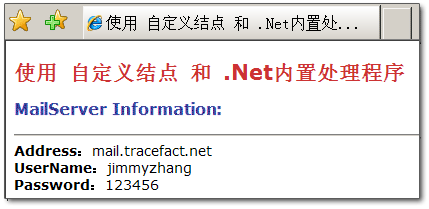 // Simple.aspx <div> <h1>使用 自定义结点 和 .Net内置处理程序</h1> <h2>MailServer Information:</h2><hr /> <b>Address</b>: <asp:Literal ID="ltrAddress" runat="server"></asp:Literal><br /> <b>UserName</b>: <asp:Literal ID="ltrUserName" runat="server"></asp:Literal><br /> <b>Password</b>: <asp:Literal ID="ltrPassword" runat="server"></asp:Literal> </div> // Simple.aspx.cs protected void Page_Load(object sender, EventArgs e) { // 返回一个Hashtable Hashtable mailServer = (Hashtable)ConfigurationManager.GetSection("mailServer"); ltrAddress.Text = mailServer["address"].ToString(); ltrUserName.Text = mailServer["userName"].ToString(); ltrPassword.Text = mailServer["password"].ToString(); }