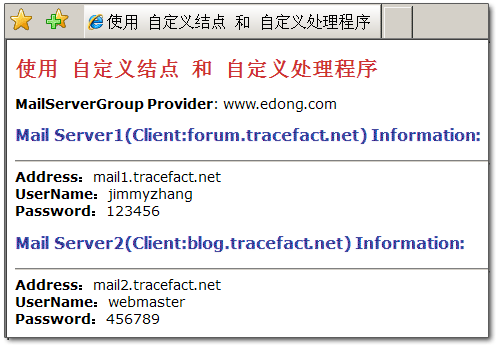 <?xml version="1.0"?> <configuration> <!-- SimpleCustom.aspx, 使用自定义结点和自定义处理程序 --> <mailServerGroup provider="www.edong.com"> <mailServer client="forum.tracefact.net"> <address>mail1.tracefact.net</address> <userName>jimmyzhang</userName> <password>123456</password> </mailServer> <mailServer client="blog.tracefact.com"> <address>mail2.tracefact.net</address> <userName>webmaster</userName> <password>456789</password> </mailServer> </mailServerGroup> </configuration>