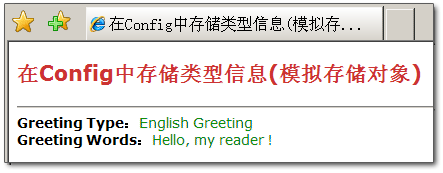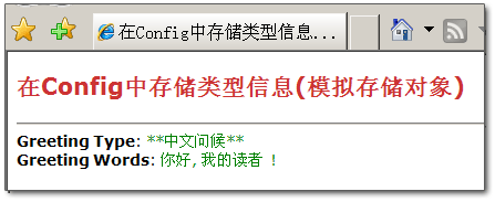 <!-- ObjectStore.aspx, 配置类型信息(存储对象) --> <greetingStrategy type="ClassLib.ChineseGreeting, ClassLib" />