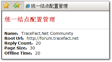 // General.aspx <h1>统一结点配置管理</h1> <hr /> <b>Name:</b><asp:Literal ID="ltrName" runat="server"></asp:Literal><br /> <b>Root Url:</b><asp:Literal ID="ltrRootUrl" runat="server"></asp:Literal><br /> <b>Reply Count:</b><asp:Literal ID="ltrReplyCount" runat="server"></asp:Literal><br /> <b>Page Size:</b><asp:Literal ID="ltrPageSize" runat="server"></asp:Literal><br /> <b>Offline Time:</b><asp:Literal ID="ltrOfflineTime" runat="server"></asp:Literal> // General.aspx.cs // 获取 ConfigManager 类型实例 ConfigManager config = (ConfigManager)ConfigurationManager.GetSection("traceFact"); ltrName.Text = config.ForumConfig.Name; ltrOfflineTime.Text = config.ForumConfig.OfflineTime.ToString(); ltrPageSize.Text = config.ForumConfig.PageSize.ToString(); ltrReplyCount.Text = config.ForumConfig.ReplyCount.ToString(); ltrRootUrl.Text = config.ForumConfig.RootUrl.ToString();
