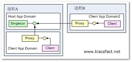 客户激活方式我们实际上已经了解过了,就是在Part.1中我们在单一进程中跨应用程序域传引用封送时的情况,我们再来回顾一下这张图: