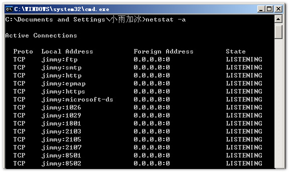 上面的程序便成功注册了两个端口用于Remoting程序的监听。运行程序,然后在Windows的命令提示符中输入 netstat -a,查看端口状况,可以看到这两个端口位于监听状态(最后两行):