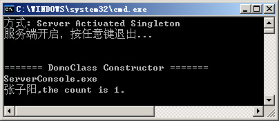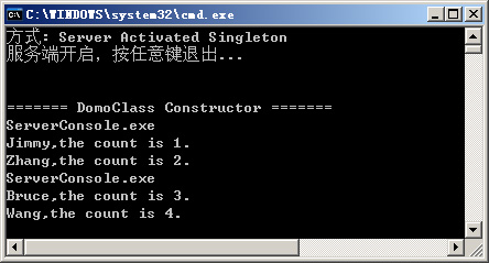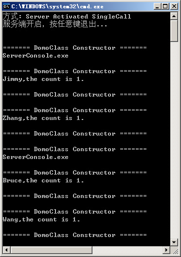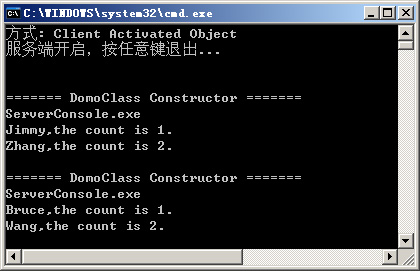 // 服务端 方式: Client Activated Object 服务端开启,按任意键退出... ======= DomoClass Constructor ======= ======= DomoClass Constructor ======= // 客户端 客户端运行结束,按任意键退出...