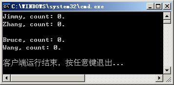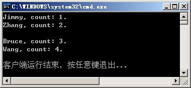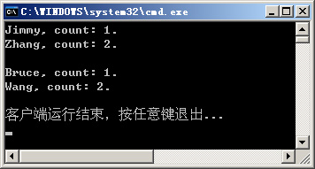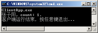 static void Main(string[] args) { // 注册远程对象 ClientActivated(); // 客户激活方式 RunTest("Jimmy", "Zhang"); RunTest("Bruce", "Wang"); Console.WriteLine("客户端运行结束,按任意键退出..."); Console.ReadKey(); } private static void RunTest(string firstName, string familyName) { DemoClass obj = new DemoClass(); obj.ShowAppDomain(); obj.ShowCount(firstName); Console.WriteLine("{0}, the count is {1}.\n",firstName, obj.GetCount()); obj.ShowCount(familyName); Console.WriteLine("{0}, the count is {1}.",familyName, obj.GetCount()); }