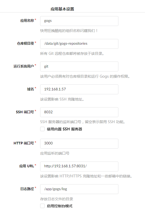 上面映射了两个端口,其中8031是http端口号,8032是ssh端口号。假设安装的服务器IP是192.168.1.57,则用浏览器打开http://192.168.1.57:8031,自动跳转至配置页面,然后按下面这样配置。