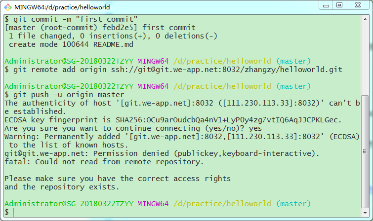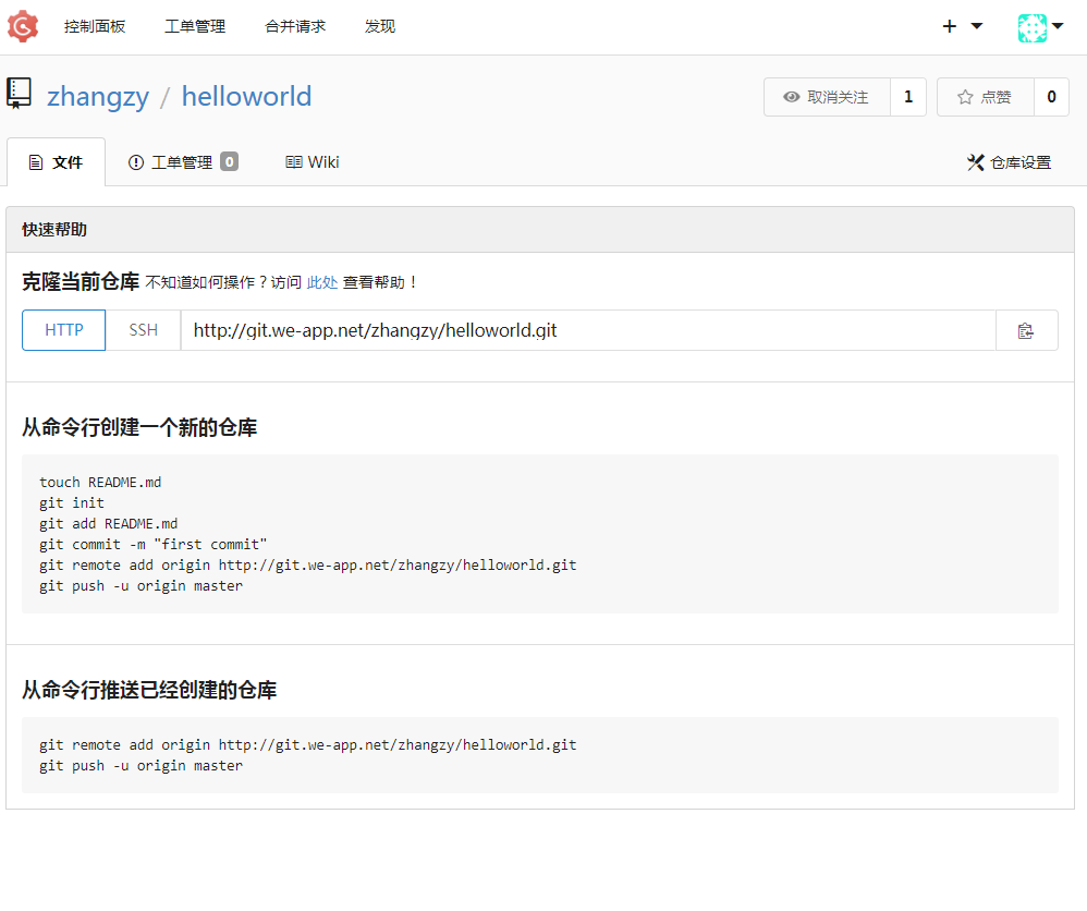 touch README.md git init git add README.md git commit -m "first commit" git remote add origin ssh://git@git.we-app.net:8032/zhangzy/helloworld.git git push -u origin master