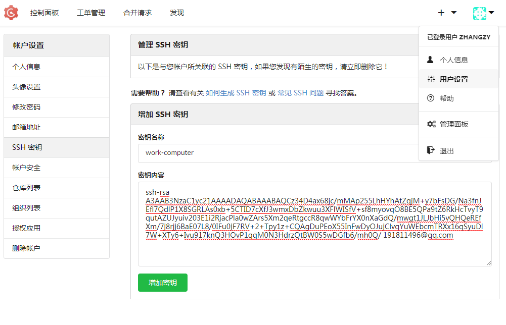 4. 进入gogos,点击右上角用户头像 --> 用户设置 --> SSH密钥,然后粘贴进去,点击“增加密钥”。