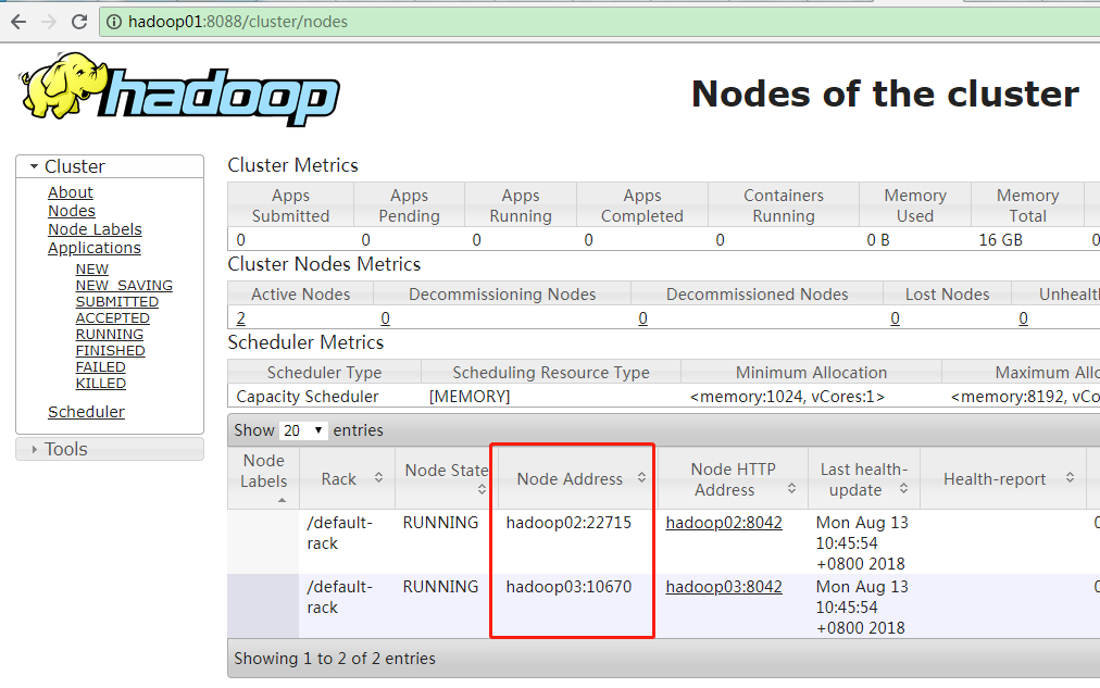 当启用YARN之后,就可以查看ResourceManager的Web UI了,使用浏览器打开http://hadoop01:8088。