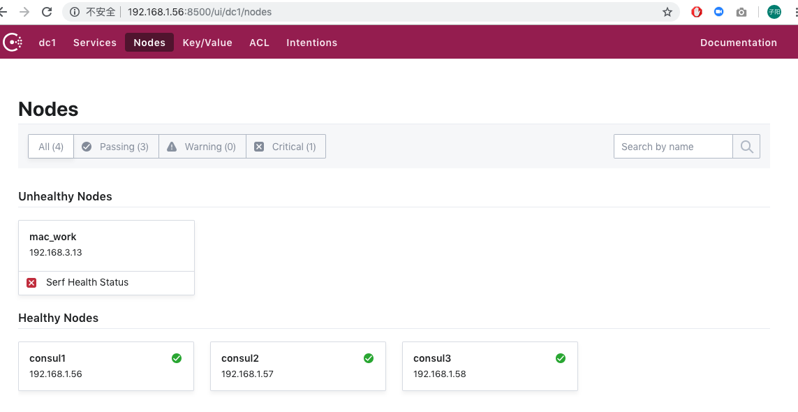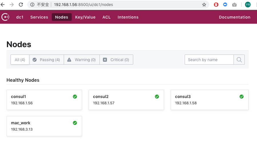 $ ./consul members Node Address Status Type Build Protocol DC Segment consul1 192.168.1.56:8301 alive server 1.4.0 2 dc1 <all> consul2 192.168.1.57:8301 alive server 1.4.0 2 dc1 <all> consul3 192.168.1.58:8301 alive server 1.4.0 2 dc1 <all> mac_work 192.168.3.13:8301 left client 1.4.0 2 dc1 <default>